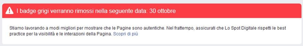 I proprietari delle Pagine Facebook sono in allarme questi giorni per una notifica che appare bene in evidenza riguardo la rimozione entro il 30 ottobre dei badge grigi.
